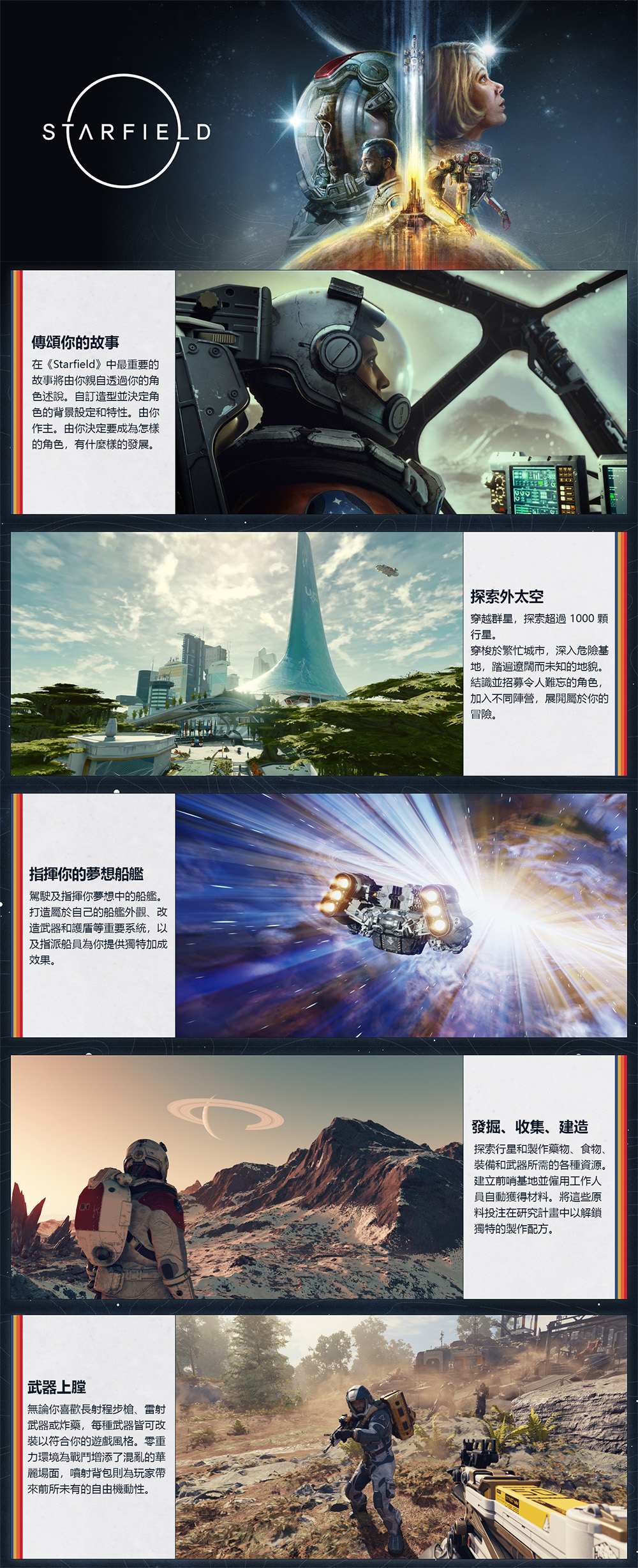 《Starfield》出自製作過《The Elder Scrolls V: Skyrim》及《Fallout 4》的獲獎製作團隊 Bethesda Game Studios 之手,是本團隊睽違超過 25 年來所打造的第一個全新宇宙。